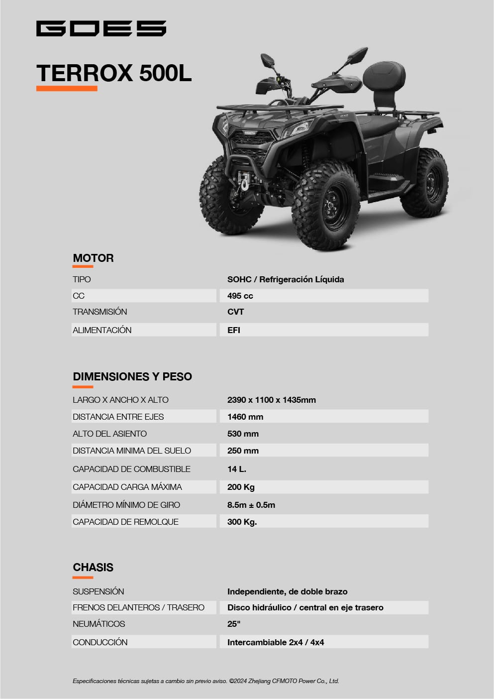 La nueva generación de ATV proporciona potencia, funcionalidad y robustez en un sólo vehículo. El Terrox 500L ofrece el rendimiento y la versatilidad que necesitás tanto en entornos recreativos como laborales.